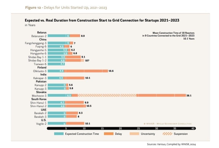 Σύμφωνα με τελευταία έκθεση “The World Newclear Industry”, ο μέσος χρόνος από την έναρξη της κατασκευής έως τη σύνδεση στο δίκτυο για τους πέντε αντιδραστήρες που ξεκίνησαν το 2023 ήταν 14,9 χρόνια, σχεδόν έξι χρόνια περισσότερα κατά μέσο όρο από τους χρόνους κατασκευής των μονάδων που ξεκίνησαν έως το 2022 (9 έτη). Αυτό περιλαμβάνει τον πυρηνικο σταθμό Mochovce-3 στη Σλοβακία, με την κατασκευή να ξεκινάει πρώτη μέσα 1985. Τέσσερις μονάδες ξεκίνησαν την παραγωγή ηλεκτρικής ενέργειας το πρώτο εξάμηνο του 2024 με μια ομάδα χωρών συμπεριλαμβανομένης της Κίνας, της Ινδίας, των ΗΑΕ και των ΗΠΑ, μετά από ένα μέσο χρονικό διάστημα μεταξύ της έναρξης της κατασκευής και της σύνδεσης στο δίκτυο 9,9 ετών. Κατά τη διάρκεια της τριετίας 2021–2023, μόνο μία από τις 18 μονάδες συνδέθηκε στο δίκτυο ανάμεσα σε εννέα χώρες και ξεκίνησε έγκαιρα.