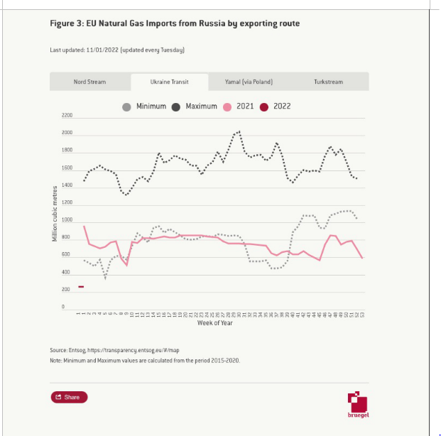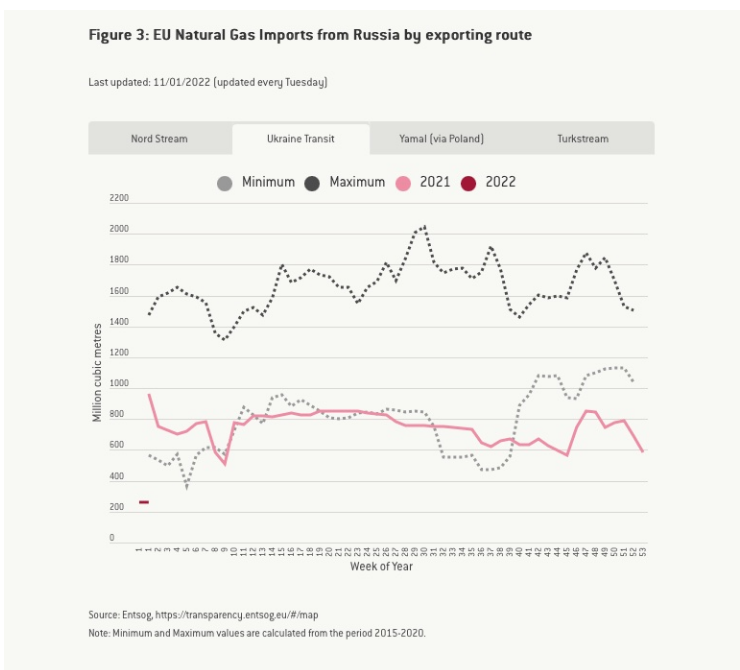 Όσον αφορά τον εφοδιασμό, σε αντίθεση με άλλους προμηθευτές (π.χ. Νορβηγία ή το LNG), η Ρωσία δεν πρόσθεσε πολλά πέρα από τις συμβατικές υποχρεώσεις. Ενώ οι Nord Stream και Turk Stream πρόσφεραν με τη μέγιστη χωρητικότητα, η διαμετακόμιση μέσω Λευκορωσίας και Ουκρανίας ήταν περιορισμένη έως ανύπαρκτη.