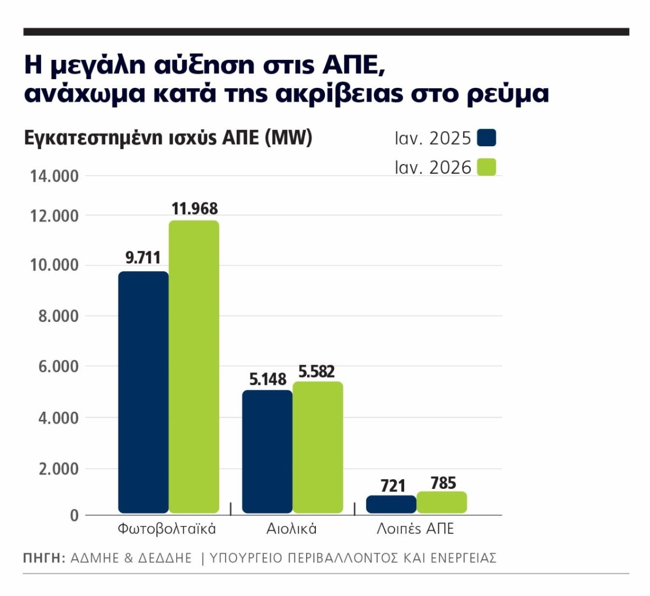 Η εξήγηση βρίσκεται σε έναν παράγοντα που μέχρι πριν από λίγα χρόνια αντιμετωπιζόταν κυρίως ως περιβαλλοντική επιλογή και μέτρο κατά της κλιματικής αλλαγής: την ταχεία ανάπτυξη των Ανανεώσιμων Πηγών Ενέργειας (ΑΠΕ). Σήμερα, η εγκατεστημένη ισχύς των ΑΠΕ στην Ελλάδα, μια μεσογειακή χώρα προικισμένη με ήλιο και άνεμο προσεγγίζει τα 18 GW (11,9 GW φωτοβολταϊκά και 5,58 GW αιολικά), έχοντας το τελευταίο 12μηνο αυξηθεί κατά 2,8 GW.
