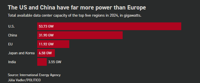 Αυτό υπογραμμίζει μια αυξανόμενη ένταση στο επίκεντρο των τεχνολογικών φιλοδοξιών της ΕΕ: η Ευρώπη θέλει να καλύψει τη διαφορά από τους παγκόσμιους ανταγωνιστές στον τομέα της τεχνητής νοημοσύνης, αλλά η φυσική υποδομή που απαιτείται για να το επιτύχει αυτό — τεράστια κέντρα δεδομένων που καταναλώνουν τεράστιες ποσότητες ενέργειας — φτάνει γρήγορα στα όριά της.