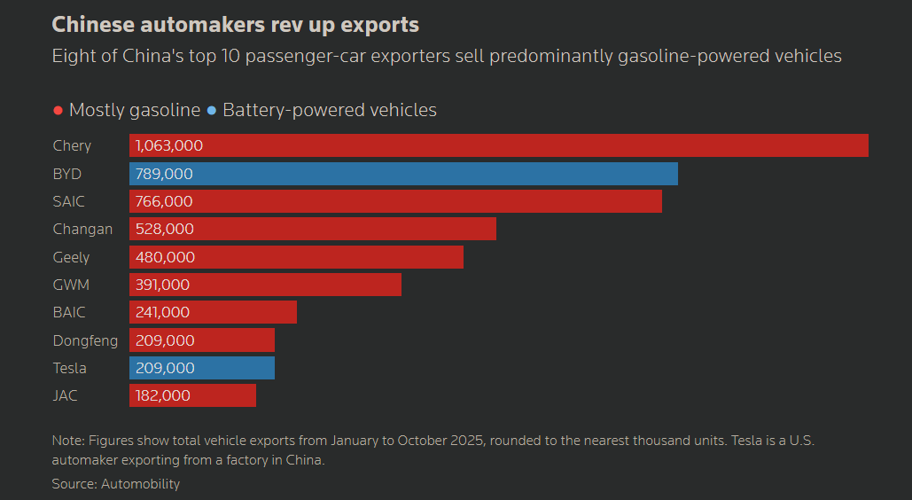 Μόνο οι εξαγωγές βενζινοκίνητων οχημάτων της Κίνας ήταν αρκετές πέρυσι για να την καταστήσουν τη μεγαλύτερη χώρα εξαγωγής αυτοκινήτων στον κόσμο σε όγκο. Αυτή η περιγραφή της παγκόσμιας επέκτασης των κινεζικών αυτοκινητοβιομηχανιών βασίζεται σε μια ανασκόπηση του Reuters των δεδομένων πωλήσεων αυτοκινήτων σε δεκάδες χώρες και σε συνεντεύξεις με περισσότερα από 30 ειδικούς του κλάδου.