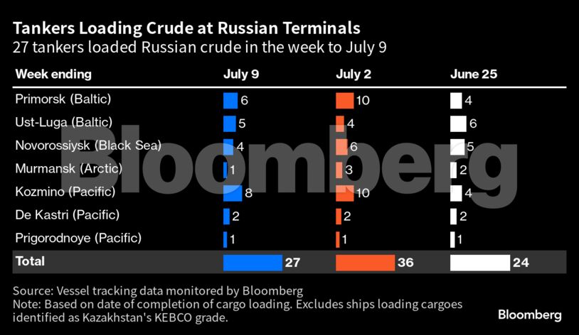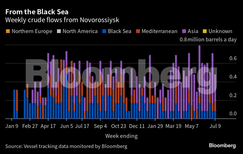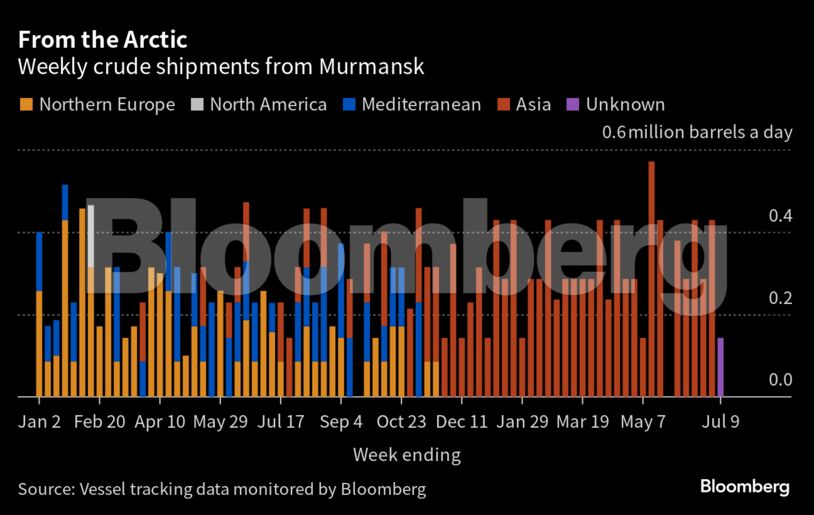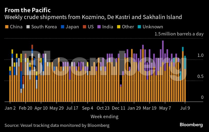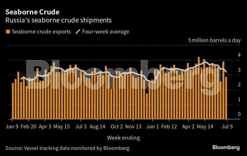 Ο μέσος όρος τεσσάρων εβδομάδων προς τους ασιατικούς πελάτες της Ρωσίας και των πλοίων τα οποία δεν έχουν δηλώσει τελικό προορισμό μειώθηκε στα 2,93 εκατ. βαρέλια/ημέρα την περίοδο μέχρι την 9η Ιουλίου, από τα 3,13 εκατ. βαρέλια/ημέρα της προηγούμενης εβδομάδας.