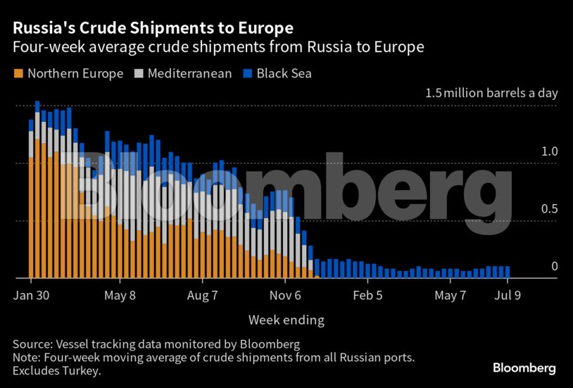 Σε μηνιαία βάση, οι συνολικές εξαγωγές ρωσικού αργού μέσω θαλασσίας οδού μέχρι τις 9 Ιουλίου είχαν μειωθεί κατά 205.000 βαρέλια/ημέρα στα 3,21 εκατομμύρια βαρέλια/ημερα. Αυτό συγκρίνεται με τον μέσο όρο των 3,38 εκατομμυρίων βαρελιών/ημέρα τον Φεβρουάριο.