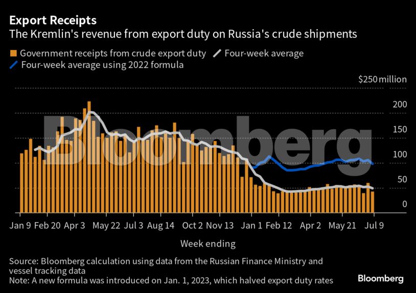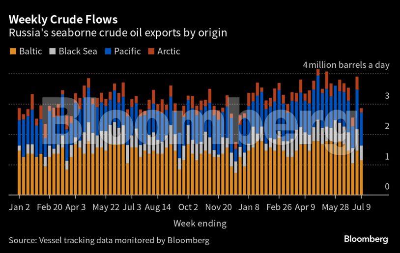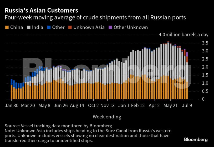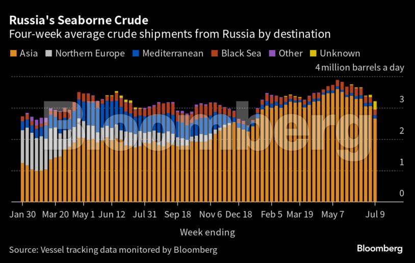 Ο μέσος όρος τεσσάρων εβδομάδων προς τους ασιατικούς πελάτες της Ρωσίας και των πλοίων τα οποία δεν έχουν δηλώσει τελικό προορισμό μειώθηκε στα 2,93 εκατ. βαρέλια/ημέρα την περίοδο μέχρι την 9η Ιουλίου, από τα 3,13 εκατ. βαρέλια/ημέρα της προηγούμενης εβδομάδας.