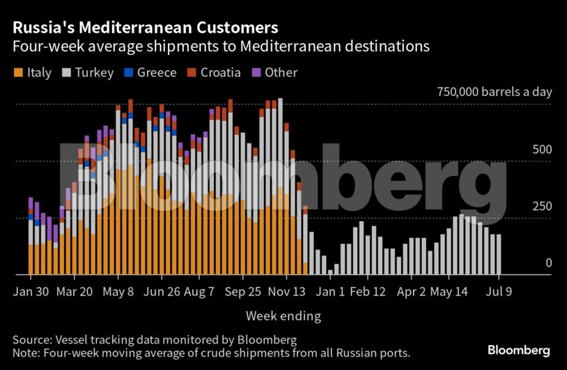 Οι εξαγωγές στην Τουρκία, η οποία αποτελεί τον μόνο πελάτη της Ρωσίας στη Μεσόγειο, έχουν παραμείνει σταθερές στα 177.000 βαρέλια/ημέρα, σε χαμηλό από τον Μάιο. Σημειωτέον πως οι εισαγωγές πετρελαίου της Τουρκίας είχαν αγγίξει υψηλό 425.000 βαρελιών/ημέρα τον Οκτώβριο.