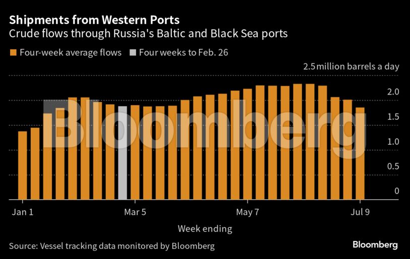 Σε μηνιαία βάση, οι συνολικές εξαγωγές ρωσικού αργού μέσω θαλασσίας οδού μέχρι τις 9 Ιουλίου είχαν μειωθεί κατά 205.000 βαρέλια/ημέρα στα 3,21 εκατομμύρια βαρέλια/ημερα. Αυτό συγκρίνεται με τον μέσο όρο των 3,38 εκατομμυρίων βαρελιών/ημέρα τον Φεβρουάριο.