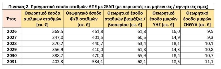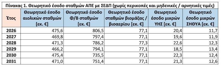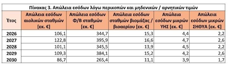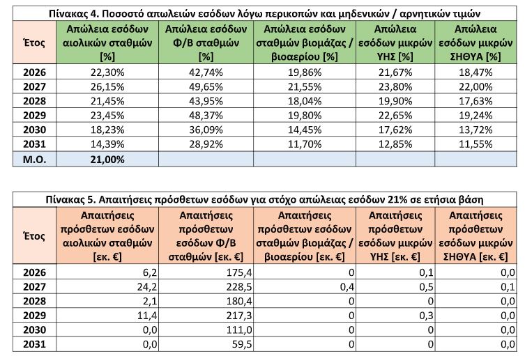 Η μελέτη λοιπόν κατέληξε στο συμπέρασμα ότι για το έτος 2026, το ποσοστό απώλειας εσόδων για τους Φ/Β Σταθμούς με ΣΕΔΠ θα ανέλθει σε περίπου 42-43%, για το έτος 2027 σε 49-50%, για το έτος 2028 σε περίπου 44%, και για το έτος 2029 σε περίπου 48%, με το μέσο όρο απώλειας εσόδων για την περίοδο 2026-2031 να κυμαίνεται στο 41-42%. Για τους Αιολικούς Σταθμούς, οι απώλειες είναι σαφώς πολύ μικρότερες, αφού για το 2026 η απώλεια εσόδων θα είναι της τάξεως του 22%, για το έτος 2027 θα ανέλθουν περίπου στο 26%, ενώ ο μέσος όρος απώλειας εσόδων για την περίοδο 2026-2031 είναι ίσος με 21%.