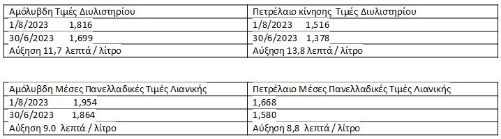 Επειδή κυκλοφορούν σχόλια, ιδίως όταν σημειώνεται αύξηση τιμών όπως το τελευταίο διάστημα, ότι δήθεν ο κλάδος μας ευθύνεται για την γρήγορη άνοδο στην αύξηση των καυσίμων, προς ορθή ενημέρωση των πολιτών, παραθέτουμε τον ακόλουθο πίνακα με επίσημα πρόσφατα στοιχεία που αντλήθηκαν από το υπουργείο Ανάπτυξης (Παρατηρητήριο τιμών υγρών καυσίμων http://www.fuelprices.gr/) και την Γενική Γραμματεία Εμπορίου & Προστασίας Καταναλωτή (http://oil.gge.gov.gr) για να αποτυπώσουμε δείγμα των ρυθμών προσαρμογής.