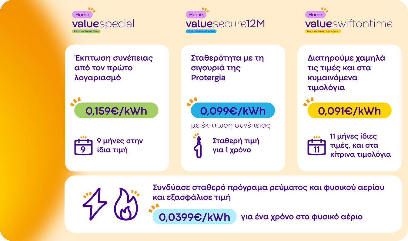 - Το «μπλε» Value Secure 12M στην εξαιρετικά ανταγωνιστική τιμή των 0,099 €/ ΚWh με έκπτωση συνέπειας για σιγουριά και ασφάλεια για 12 μήνες.