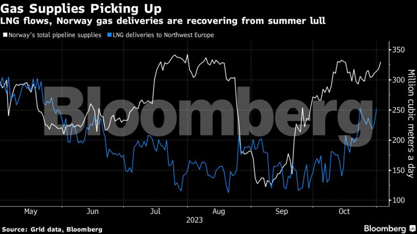 Παράλληλα, η αύξηση των ροών υγροποιημένου φυσικού αερίου, η ανάκαμψη της νορβηγικής παραγωγής και τα σχεδόν πλήρη αποθέματα συμβάλλουν επίσης στη διατήρηση των τιμών υπό έλεγχο. Τα συμβόλαια μελλοντικής εκπλήρωσης του πρώτου μήνα έχουν υποχωρήσει περισσότερο από 15% από τότε που έφτασαν στο αποκορύφωμά τους στα μέσα Οκτωβρίου λόγω των φόβων για περιφερειακή κλιμάκωση του πολέμου Ισραήλ-Χαμάς.