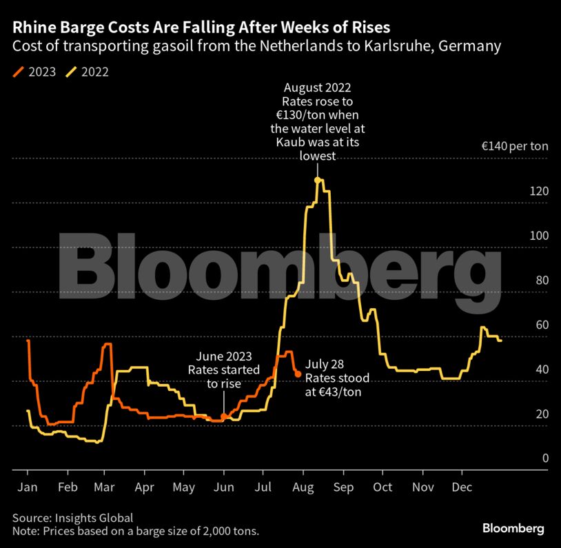 Μετά από τα σκληρά κύματα καύσωνα τα οποία έπληξαν τη νότια Ευρώπη, η στάθμη του ποταμού στο Kaub έχει φτάσει σε χαμηλά τα οποία σημαίνουν πως τα ποταμόπλοια θα μπορούν να κουβαλούν μόλις το 50% του συνήθους φορτίου τους. Αν και οι πρόσφατες βροχοπτώσεις έχουν περιορίσει το πρόβλημα, ακόμα και οι μικρές αλλαγές μπορεί να έχουν σημαντικές επιπτώσεις. Μία μείωση 10 εκατοστών στη στάθμη του ποταμού αντιστοιχεί σε 100 λιγότερους τόνους ανά ποταμόπλοιο, σύμφωνα με τον επικεφαλής της Swiss Rhine Ports, Φλοριάν Ρόθλινγκσεφερ.