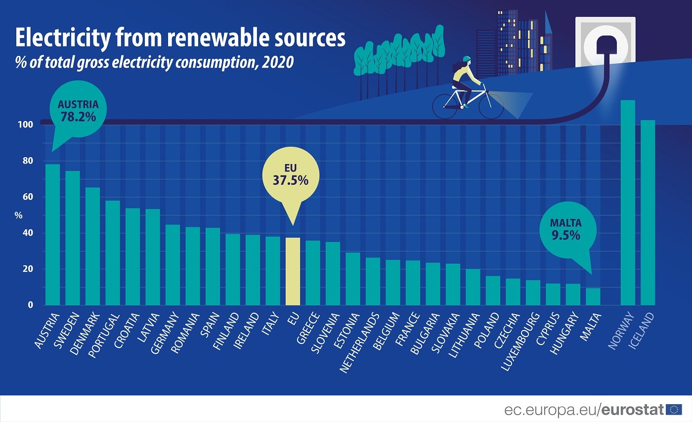 Μεταξύ των κρατών μελών της ΕΕ, περισσότερο από το 70% της ηλεκτρικής ενέργειας που καταναλώθηκε το 2020 παρήχθη από ανανεώσιμες πηγές στην Αυστρία (78%) και τη Σουηδία (75%). Η παραγωγή ηλεκτρικής ενέργειας από ανανεώσιμες πηγές ήταν επίσης υψηλή και αντιπροσώπευε περισσότερο από το ήμισυ της ηλεκτρικής ενέργειας που καταναλώθηκε στη Δανία (65%), την Πορτογαλία (58%), την Κροατία και τη Λετονία (και οι δύο 53%). Η Ελλάδα με ποσοστό 35,8% βρίσκεται λίγο κάτω από τον ευρωπαϊκό μέσο όρο (37%).
