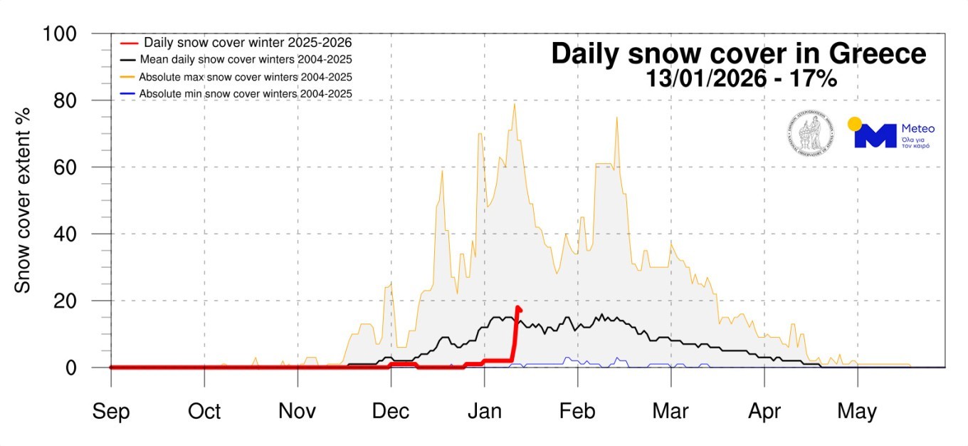 Σύμφωνα με την ανάλυση αυτή, στις 12 Ιανουαρίου 2026, η χιονοκάλυψη έφτασε το 19% της συνολικής έκτασης της χώρας, ποσοστό που είναι ελαφρώς υψηλότερο από τον μέσο όρο της εποχής, λαμβάνοντας υπόψιν τη μέση ημερήσια χιονοκάλυψη από το 2004 (14%).