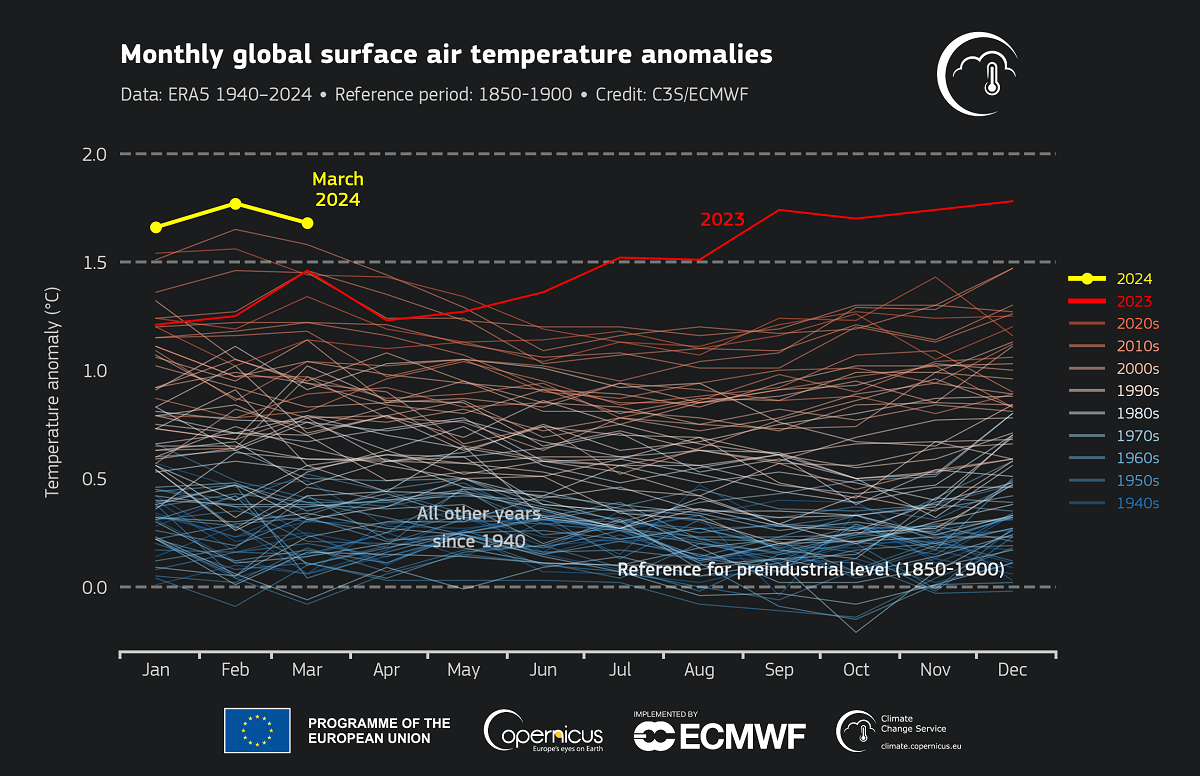 Ο Μάρτιος, με μέση παγκόσμια θερμοκρασία 1,68 βαθμούς Κελσίου υψηλότερη από οποιονδήποτε αντίστοιχο μήνα της προβιομηχανικής εποχής, παράλληλα σηματοδοτεί τον δέκατο μήνα στη σειρά που το θερμόμετρο έχει χτυπήσει «κόκκινο».