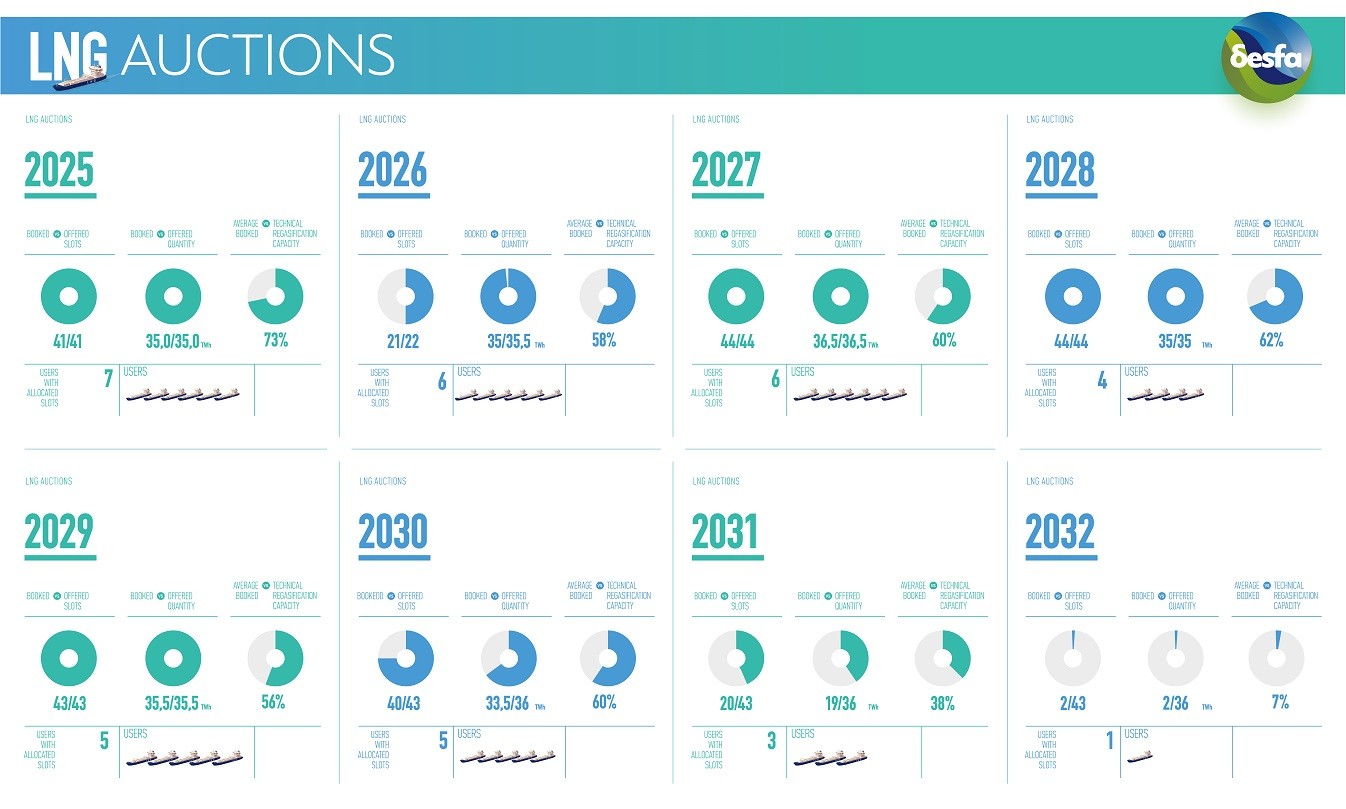 Ειδικότερα, για το έτος 2025 δεσμεύθηκαν και τα 41 χρονοπαράθυρα (slots) που προσφέρθηκαν, τα οποία αντιστοιχούν στην εκφόρτωση συνολικής ποσότητας 35 TWh. Αντίστοιχα, στη δημοπρασία για το 2026 δεσμεύθηκαν 21 από τα 22 συνολικά προσφερόμενα χρονοπαράθυρα, για την εκφόρτωση ποσότητας 35 TWh από τη συνολικά προσφερόμενη ποσότητα των 35,5 TWh. Για το 2027, δεσμεύθηκαν και τα 44 προσφερόμενα χρονοπαράθυρα, που αντιστοιχούν στην εκφόρτωση ποσότητας ύψους 36,5 TWh. Αντίστοιχα, για το 2028, και τα 44 προσφερόμενα χρονοπαράθυρα δεσμεύθηκαν, εξυπηρετώντας την εκφόρτωση συνολικής ποσότητας 35 TWh. Για το έτος 2029, δεσμεύθηκαν και τα 43 προσφερόμενα χρονοπαράθυρα, για την εκφόρτωση ποσότητας 35,5 TWh. Για το 2030, δεσμεύθηκαν 40 από τα προσφερόμενα χρονοπαράθυρα, αντιστοιχώντας σε ποσότητα ύψους 33,5 TWh. Για το 2031, δεσμεύθηκαν 20 από τα προσφερόμενα χρονοπαράθυρα, που αντιστοιχούν σε ποσότητα ύψους 19 TWh. Τέλος, παρά τη μεγάλη χρονική απόσταση, ενδιαφέρον εκδηλώθηκε και για το 2032, με τη δέσμευση 2 χρονοπαραθύρων, συνολικής ποσότητας 2 TWh.