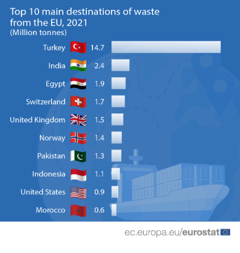 Σύμφωνα με την Eurostat η Τουρκία είναι ο κυριότερος προορισμός για τα ευρωπαϊκά απόβλητα, με όγκο περίπου 14,7 εκατομμυρίων τόνων το 2021. Ο δεύτερος σημαντικότερος προορισμός ήταν η Ινδία, η οποία δέχθηκε σχεδόν 2,4 εκατομμύρια τόνους αποβλήτων από την ΕΕ το 2021, ακολουθούμενη από την Αίγυπτο (1,9 εκατομμύρια τόνοι), την Ελβετία (1,7 εκατομμύρια τόνοι), το Ηνωμένο Βασίλειο (1,5 εκατομμύρια τόνοι), τη Νορβηγία (1,4 εκατομμύρια τόνοι), το Πακιστάν (1,3 εκατομμύρια τόνοι), την Ινδονησία (1,1 εκατομμύρια τόνοι), τις Ηνωμένες Πολιτείες (0,9 εκατομμύρια τόνοι) και το Μαρόκο (0,6 εκατομμύρια τόνοι).