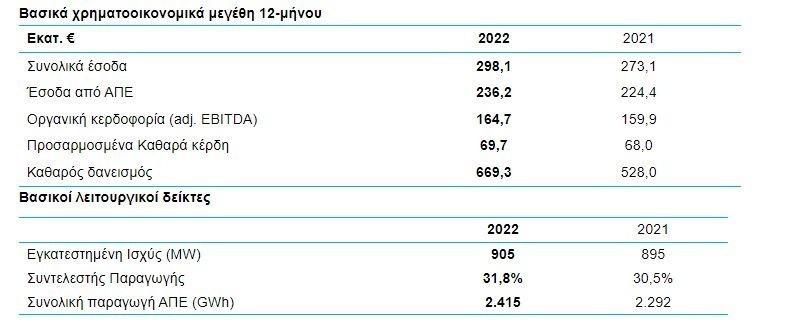 Τα έσοδα του Ομίλου, χάρη στην υψηλότερη παραγωγή των μονάδων ΑΠΕ, αυξήθηκαν σε 298 εκατ. ευρώ έναντι 273,1 εκατ. ευρώ το 2021, και οδήγησαν την προσαρμοσμένη λειτουργική κερδοφορία από συνεχιζόμενες δραστηριότητες (adj. EBITDA) στα 164,7 εκατ. ευρώ (+3,0% y-o-y) και τα προσαρμοσμένα καθαρά κέρδη (adj. net profit) στα 69,7 εκατ. ευρώ (+2,5% y-o-y).