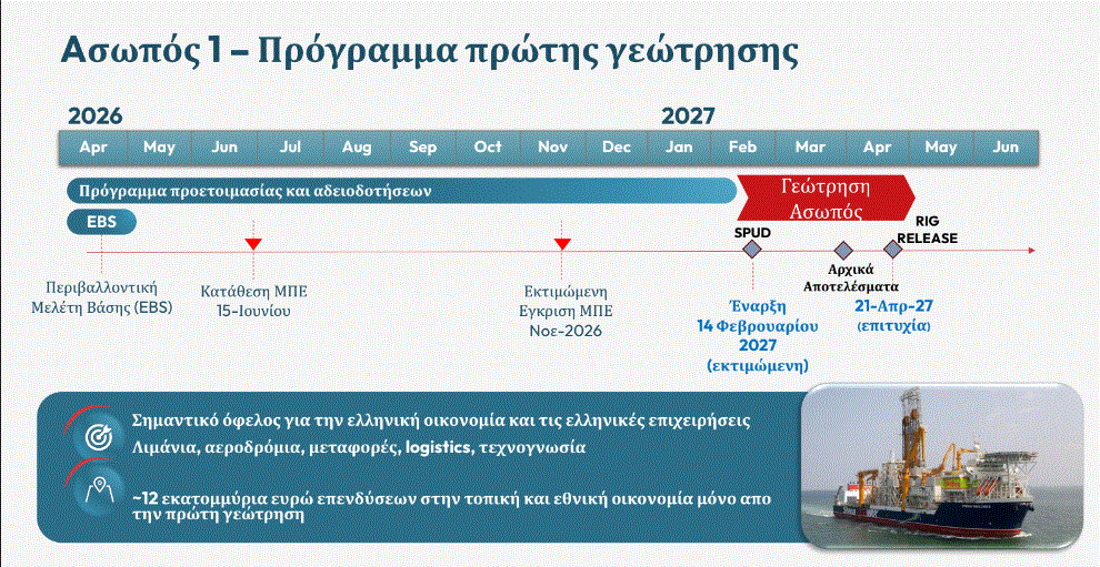 Το έργο στο βορειοδυτικό Ιόνιο εισέρχεται πλέον στην πιο κρίσιμη φάση του, με την πρώτη ερευνητική γεώτρηση να τοποθετείται χρονικά το Φεβρουάριο του 2027 και να αποτελεί το καθοριστικό βήμα για την επιβεβαίωση ή μη της ύπαρξης εκμεταλλεύσιμου κοιτάσματος.