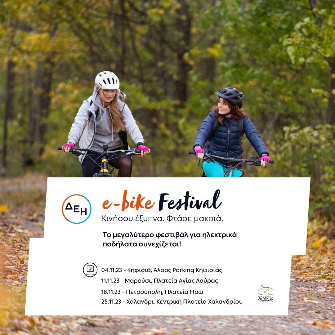 Να γνωρίσουν από κοντά και να ανακαλύψουν τις ευκολίες και τις δυνατότητες που προσφέρουν τα ηλεκτρικά ποδήλατα, καλεί η ΔΕΗ τους κατοίκους και επισκέπτες της Αθήνας. Το ΔΕΗ e-bike Festival, που συνεχίζεται για 3η χρονιά, πραγματοποιείται σε 4 περιοχές της Αθήνας μέσα στον Νοέμβριο και συγκεκριμένα:
