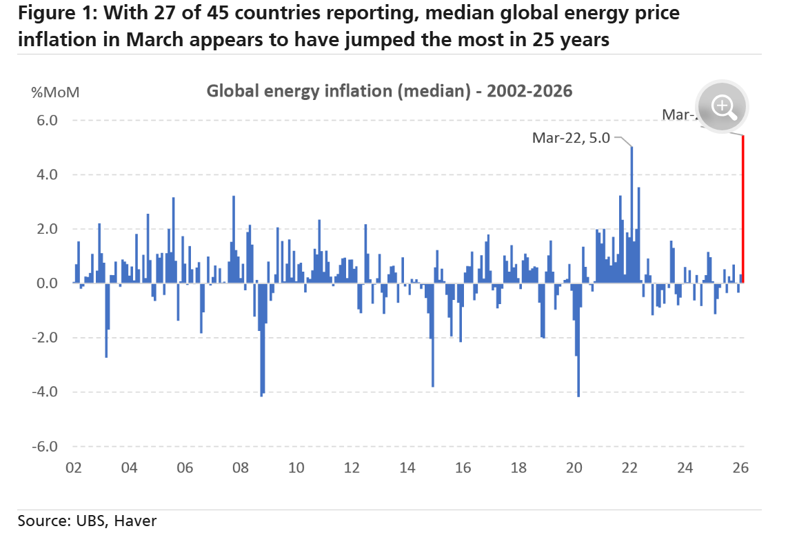 Η παγκόσμια οικονομία εισέρχεται εκ νέου σε φάση ενεργειακού σοκ, με τα τελευταία στοιχεία να δείχνουν ότι ο Μάρτιος του 2026 κατέγραψε τη μεγαλύτερη μηνιαία αύξηση τιμών ενέργειας των τελευταίων 25 ετών. Σύμφωνα με την ανάλυση της ελβετικής τράπεζας UBS, η άνοδος αυτή δεν αποτελεί απλώς μια συγκυριακή μεταβολή, αλλά ένα συγχρονισμένο παγκόσμιο φαινόμενο που επαναφέρει στο προσκήνιο τον πληθωριστικό κίνδυνο.