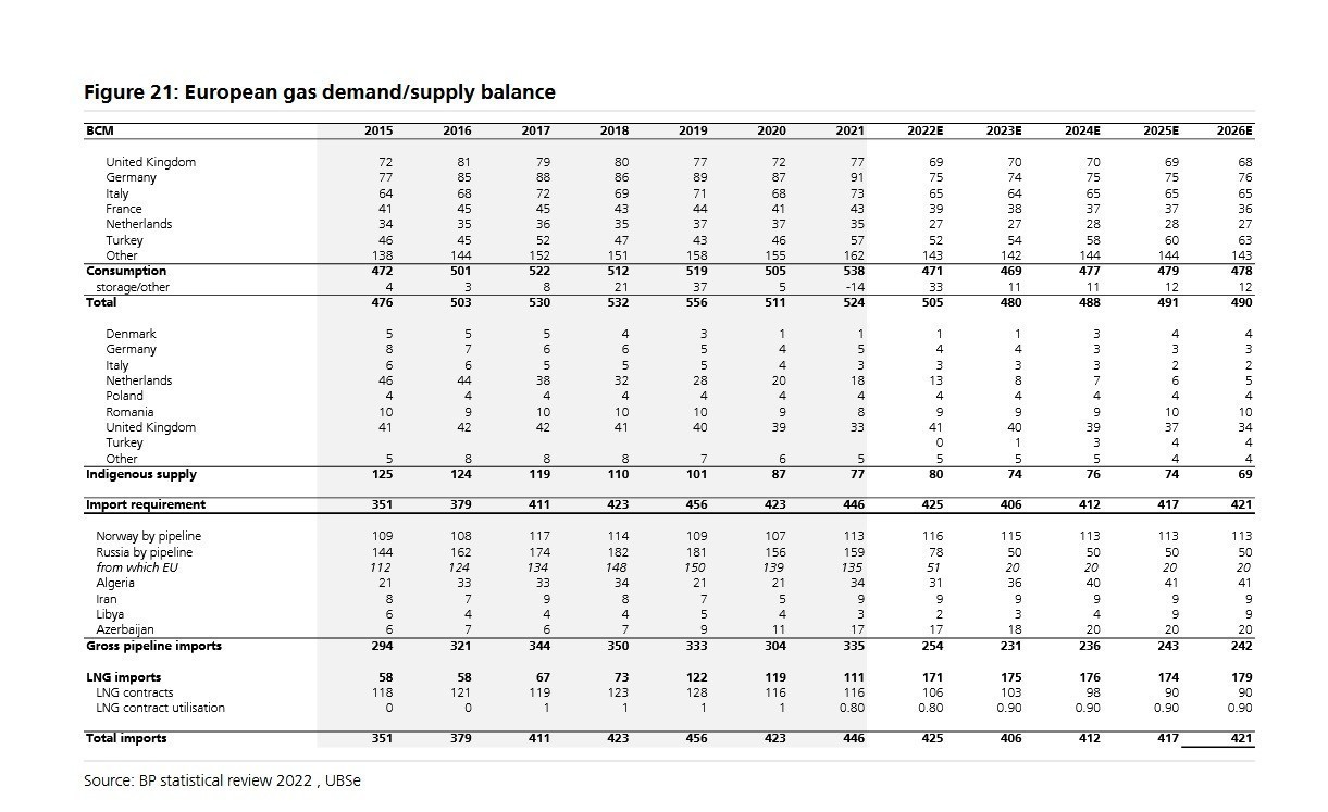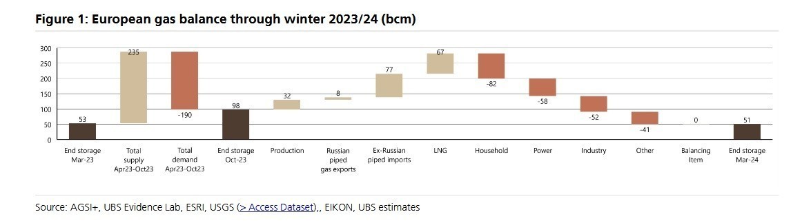 Σύμφωνα με τους αναλυτές της τράπεζας, Χένρι Πάτρικοτ και Ναγιούνγκ Κιμ, το βασικό σενάριο της UBS υποδεικνύει μείωση της έλλειψης προσφοράς και επαρκή ευρωπαϊκά αποθεματικά στα τέλη του χειμώνα, σε επίπεδο άνω του 50%.