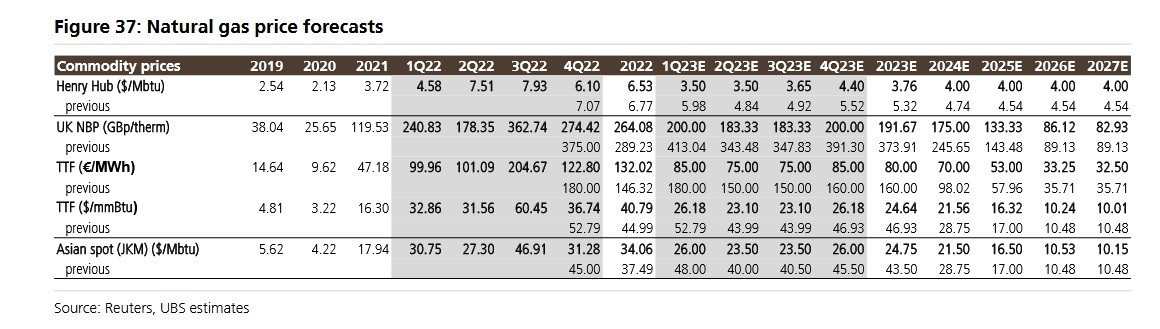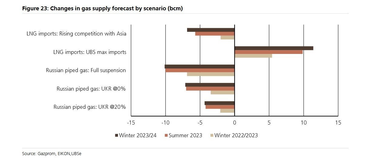 Στο δυσμενές σενάριό της, η UBS υπογραμμίζει την αβεβαιότητα των αναλυτών όσον αφορά την αύξηση του ανταγωνισμού για την εισαγωγή υγροποιημένου φυσικού αερίου, την πιθανότητα ακραίων καιρικών φαινομένων και την ελλειμματική ποσότητα εισαγωγών ρωσικού υδρογονάνθρακα.