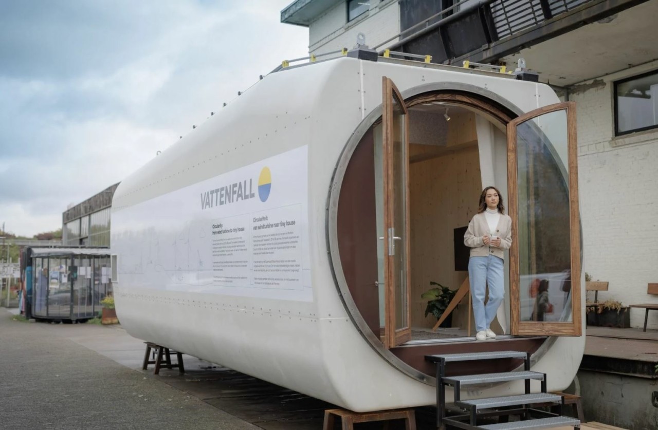 Συγκεκριμένα, η Vattenfall και το στούντιο σχεδιασμού Superuse μετέτρεψαν την άτρακτο, -το πάνω μέρος-, μιας ανεμογεννήτριας, σε ένα μικροσκοπικό σπίτι. Αυτή η άτρακτος έχει πλάτος τέσσερα μέτρα, μήκος δέκα μέτρα και ύψος τρία μέτρα και προέρχεται από μια τουρμπίνα που βρισκόταν στην Αυστρία για 20 χρόνια. Με το μικροσκοπικό σπίτι, η Vattenfall δείχνει πώς τα υλικά μπορούν να επαναχρησιμοποιηθούν με καινοτόμους τρόπους. Το εν λόγω μίνι σπίτι εκτέθηκε σε περίοπτη θέση κατά τη διάρκεια της Dutch Design Week 2024 που έγινε από τις 19 έως τις 27 Οκτωβρίου.
