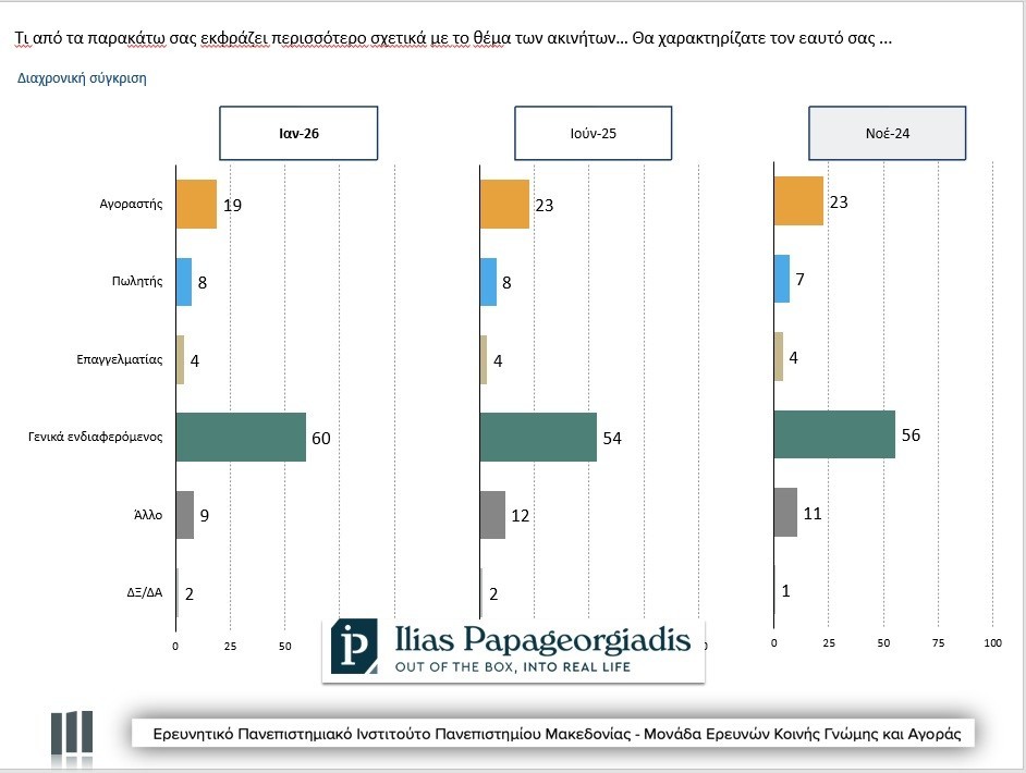 Το ποσοστό αυτών που δηλώνουν αγοραστές έπεσε από το 23% στο 19% και την ίδια ώρα όσοι θέλουν να αγοράσουν σπίτι «άμεσα, εντός εξαμήνου ή εντός του χρόνου» υποχώρησε από το 34% (Νοέμβριος 2024) στο 23% σήμερα. Στην πράξη λοιπόν μόλις το… 4,37% των ερωτώμενων δηλώνουν αγοραστές που θέλουν να αγοράσουν ακίνητο εντός 12μήνου.