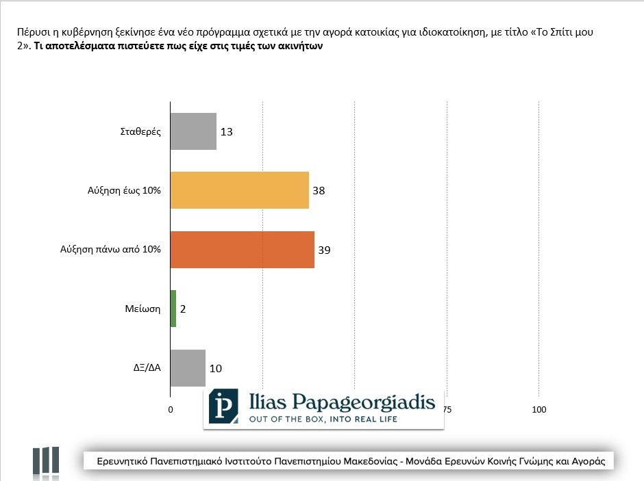 Στην ερώτηση για τα αποτελέσματα που είχε το πρόγραμμα «Το Σπίτι μου, 2» στις τιμές πώλησης των κατοικιών, το 39% απάντησε «αύξηση πάνω από 10%», το 38% «αύξηση ως 10%», σταθερές είδε τις τιμές το 13% και το 2% θεωρεί ότι αυτές μειώθηκαν λόγω του προγράμματος. Έτσι περίπου το 77% των πολιτών θεωρεί πως το πρόγραμμα είχε ως αποτέλεσμα την άνοδο των τιμών (με αυτή τη γνώμη συμφωνεί το 87% των επαγγελματιών της αγοράς).