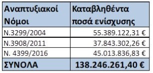Συγκεκριμένα, 138 εκατ. ευρώ αφορούν σε 155 επενδυτικά σχέδια που είχαν υποβληθεί στην κεντρική υπηρεσία και 81 εκατ. ευρώ αποτελούν ενισχύσεις 355 επενδυτικών σχεδίων στις περιφέρειες.