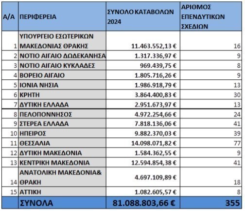 Τα περισσότερα επενδυτικά σχέδια αφορούν στην Θεσσαλία ακολουθούν, στη δεύτερη θέση, Κεντρική Μακεδονία και Στερεά Ελλάδα και μετά η Ήπειρος.