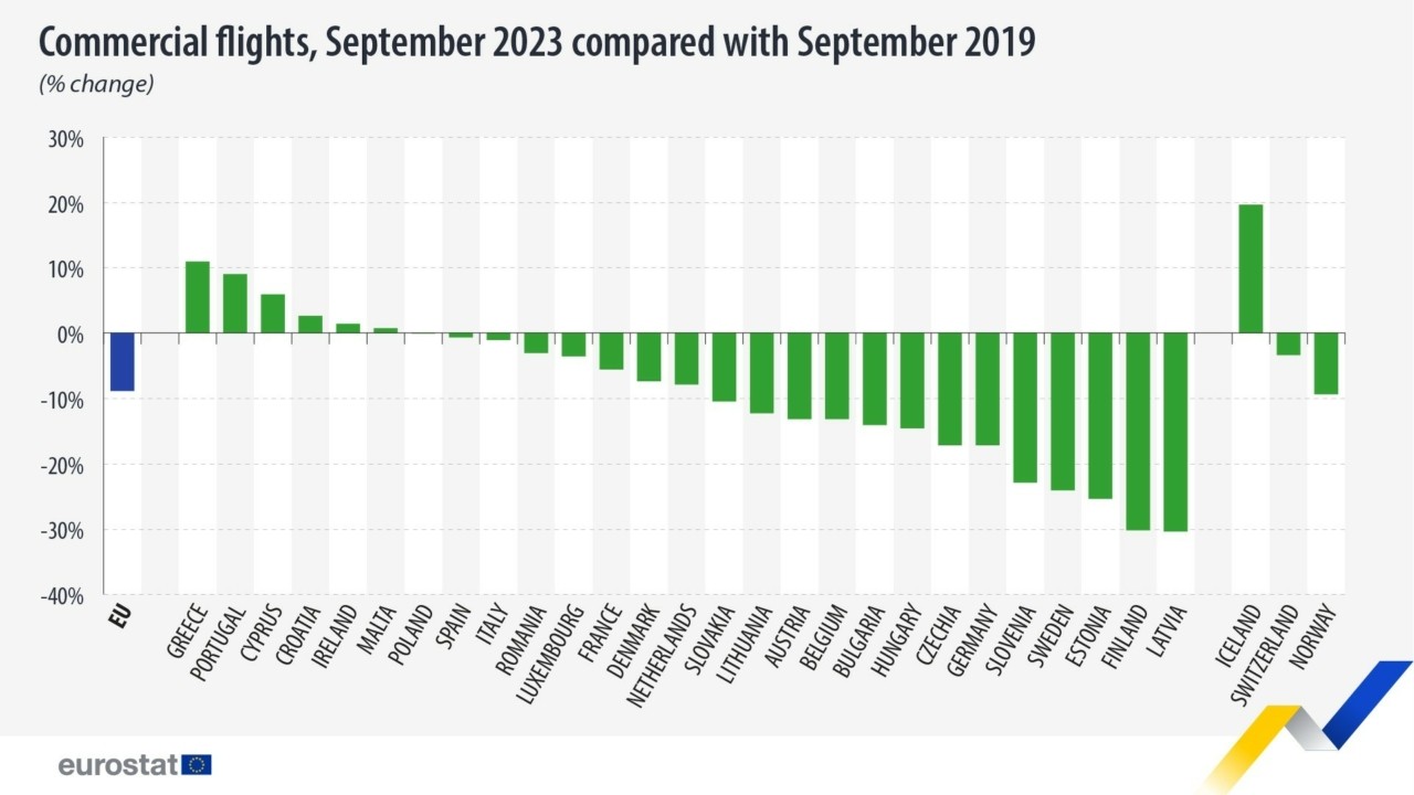 Με βάση τα στοιχεία της Eurostat, συνολικά το Σεπτέμβριο του 2023, πραγματοποιήθηκαν 605.806 εμπορικές πτήσεις στην Ε.Ε., με αύξηση κατά αύξηση 7,9% σε σύγκριση με τον αντίστοιχο αριθμό πτήσεων τον Σεπτέμβριο του 2022. Ωστόσο, πανευρωπαϊκά το νούμερο παρέμεινε 8,9% χαμηλότερο από τον αριθμό πτήσεων για τον ίδιο μήνα το 2019.