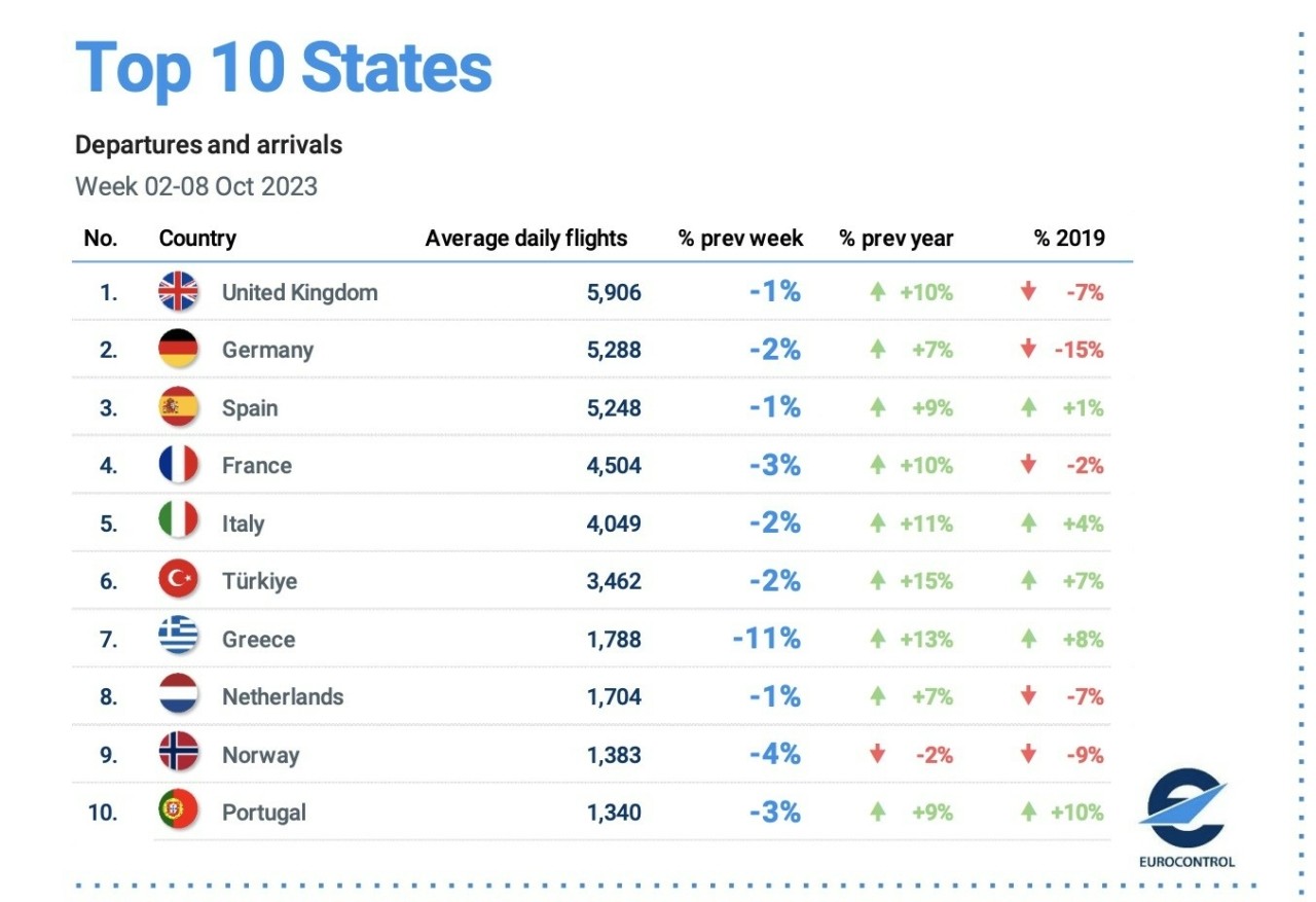 Η Ελλάδα βρίσκεται και στο πανευρωπαϊκό τοπ 10 όσον αφορά την κίνηση των αεροδρομίων και για το ξεκίνημα του Οκτωβρίου όπως προκύπτει με βάση τα στοιχεία από τον Ευρωπαϊκό Οργανισμό Ελέγχου και Ασφάλειας Πτήσεων Eurocontrol με την πρώτη εβδομάδα του Οκτωβρίου 2- 8 Οκτωβρίου να παρουσιάζει ένα μέσο ημερήσιο αριθμό πτήσεων στις 1.788, νούμερο αυξημένο κατά 8% σε σχέση με την αντίστοιχη περίοδο του 2019 (+15% έναντι του 2022).