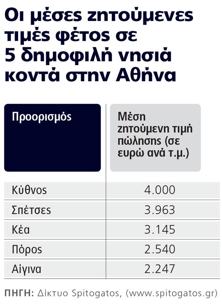 Τα νησιά του Αργοσαρωνικού αλλά και από τις Κυκλάδες, οι προορισμοί που βρίσκονται πιο κοντά στην Αθήνα με δρομολόγια έως μιάμιση ώρα από το Λαύριο, όπως η Κύθνος και η Τζια, είναι αυτά που προτιμώνται ιδιαίτερα από το ελληνικό, αλλά και από το ξένο κοινό με δεδομένη και την αύξηση της προσφοράς τα τελευταία χρόνια ειδικά σε ακίνητα υψηλών προδιαγραφών – και συχνά ιδιαίτερης αρχιτεκτονικής. Οπως προκύπτει από τις δημοσιευμένες αγγελίες στο δίκτυο του «Spitogatos», η μέση τιμή γενικότερα στα νησιά του Αργοσαρωνικού φέτος κυμαίνεται στα 2.000 ευρώ ανά τ.μ. Η άνοδος είναι πιο ήπια σε σύγκριση με την ηπειρωτική Ελλάδα -λίγο πάνω από το 20% στη διάρκεια της τελευταίας πενταετίας- δεδομένου ότι η πορεία της ανόδου στα νησιά του Αργοσαρωνικού έχει ξεκινήσει από σαφώς πιο υψηλή βάση. Επίσης, πιο ήπια είναι και η άνοδος στις μέσες ζητούμενες τιμές σε ετήσια βάση, στο +4% έναντι του περσινού καλοκαιριού.