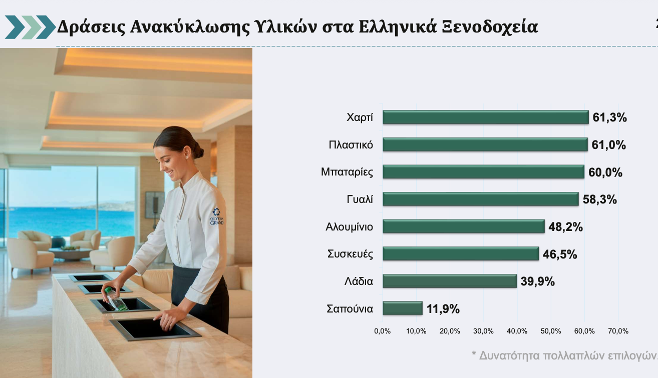 -Για τη διαχείριση αποβλήτων τόσο οι δράσεις ανακύκλωσης όσο και οι δράσεις μείωσης χρήσης υλικών στα ελληνικά ξενοδοχεία, το μεγαλύτερο ποσοστό αφορούν σε χαρτί και πλαστικό σε ποσοστό πάνω από 61% και πάνω από 39% αντίστοιχα.