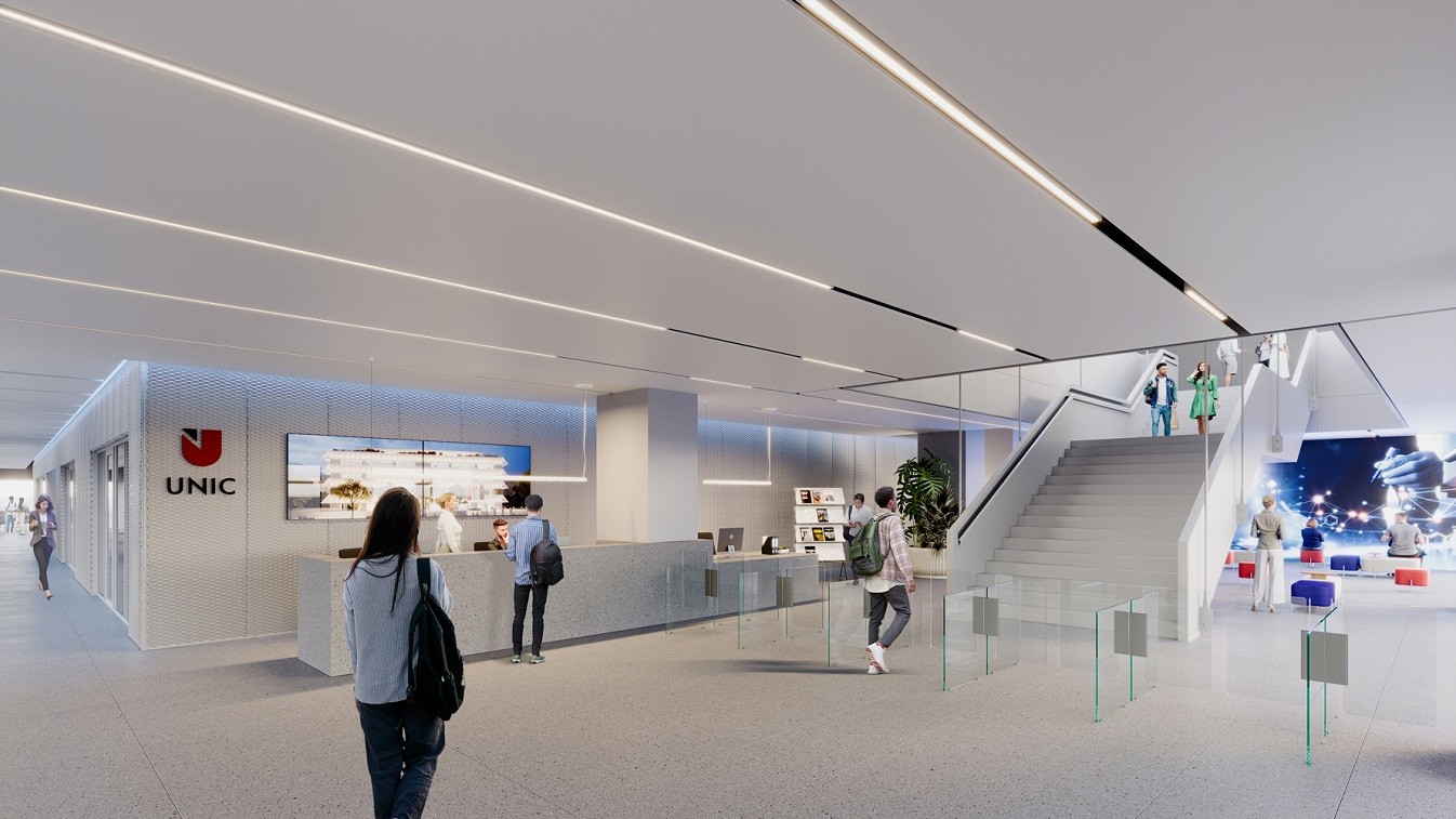 Μια συνολική απόφαση της ομάδας μηχανικών, αρχιτεκτόνων και συμβούλων του έργου ήταν η διατήρηση και ενίσχυση του αρχικού φέροντα οργανισμού για λόγους βιωσιμότητας. Η νέα πρόσοψη σχεδιάστηκε με τρόπο που συνδυάζει οριζόντια, διάτρητα στοιχεία σκίασης με γυάλινες επιφάνειες που επιτρέπουν άπλετο φυσικό αερισμό και φωτισμό. «Η διατήρηση του υπάρχοντος σκελετού αποτελεί από μόνη της μια ριζοσπαστική και ενεργειακά αναγκαία απόφαση για την κατακόρυφη μείωση του αποτυπώματος άνθρακα, σε μια εποχή που οι κατασκευές είναι απαραίτητο να είναι και βιώσιμες». Οι ίδιοι επισημαίνουν ότι ένα κτίριο που προορίζεται για εκπαιδευτική χρήση, απαιτεί ειδικές τεχνικές και λειτουργικές προδιαγραφές που σχετίζονται άμεσα με τη σχολή που θα φιλοξενείται: «Στην Ιατρική σχολή που δημιουργήθηκε για το UNIC, παρείχαμε ιδιαίτερα εξελιγμένες μηχανολογικές υποδομές που υποστηρίζουν εργαστήρια, εξοπλισμό υψηλής ισχύος, συστήματα εξαερισμού και ασφάλειας. Επιπλέον, οι κοινόχρηστοι χώροι πρέπει να είναι ευρύχωροι και ευέλικτοι, ώστε να επιτρέπουν δραστηριότητες με αλληλεπίδραση μεταξύ φοιτητών και καθηγητών, και να δημιουργούν μια ροή κίνησης. Σημαντικός στόχος των εκπαιδευτικών κτιρίων είναι το ανοικτό μαθησιακό περιβάλλον, σε ευχάριστο και φωτεινό περιβάλλον, και οπτικές συνδέσεις μεταξύ διαφορετικών χώρων μάθησης. Ο σχεδιασμός πρέπει επίσης να ενθαρρύνει την κοινωνικοποίηση, την ανταλλαγή ιδεών και την προσαρμοστικότητα σε μελλοντικές εκπαιδευτικές ανάγκες».