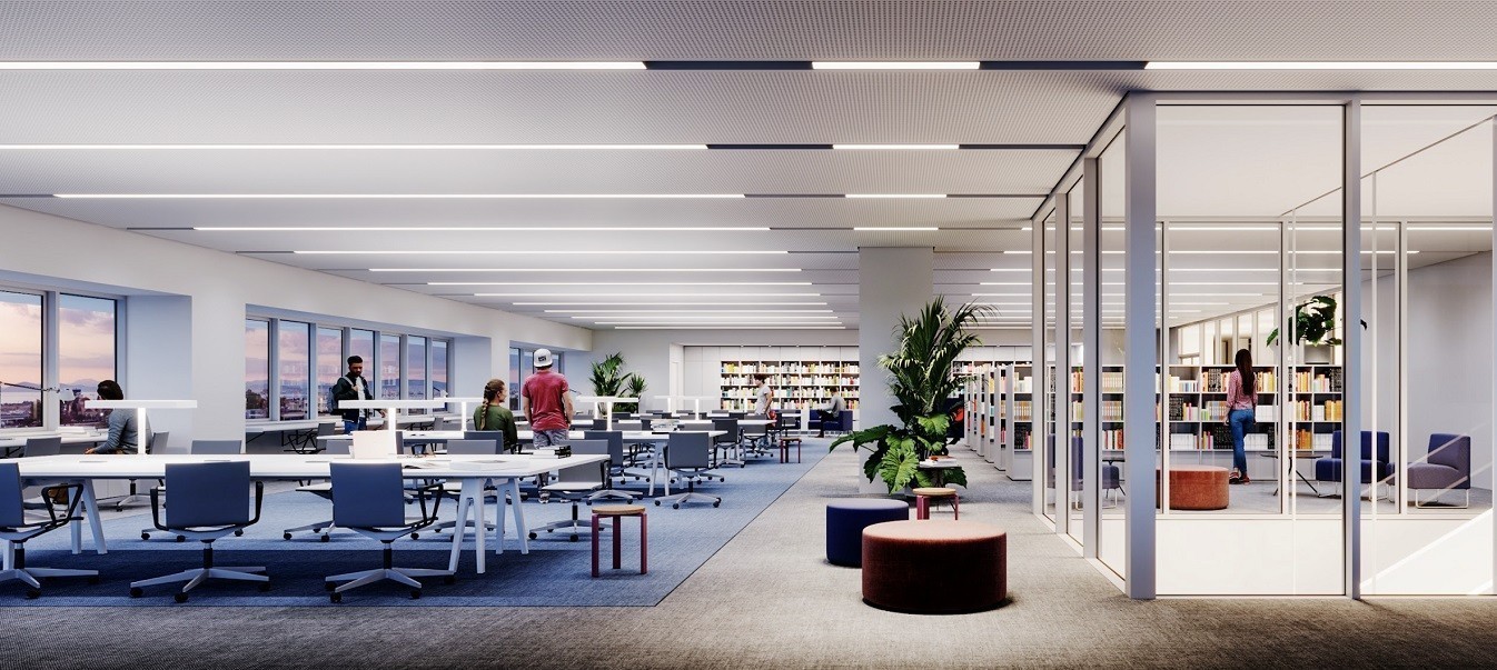 Αυτή η ενέργεια, ανοίγει οπτικά προς τις κύριες εγκαταστάσεις διδασκαλίας, ενεργοποιεί την οπτική σύνδεση μεταξύ ορόφων, και προσφέρει διάφορες διαδρομές που αποκαλύπτουν παράλληλα το πλήρες ύψος του κτιρίου.