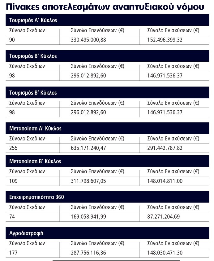 Τα στοιχεία αυτά αφορούν τους πρώτους δύο κύκλους του καθεστώτος Μεταποίηση και Εφοδιαστική Αλυσίδα, τους αντίστοιχους του Τουρισμού, τον πρώτο κύκλο του Επιχειρηματικότητα 360, καθώς και εκείνου της Αγροδιατροφής.