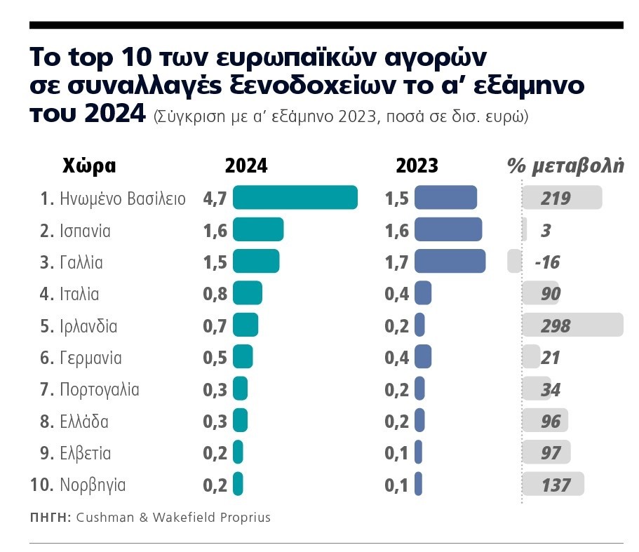 Το 2024 λοιπόν προβλέπεται ότι θα αποτελέσει ένα σημαντικό ορόσημο για τα ξενοδοχειακά deals στην Ελλάδα, η οποία ήδη είχε ανέβει σημαντικά στην ευρωπαϊκή λίστα από την περσινή χρονιά. Το 2023 η αξία των ξενοδοχείων που πωλήθηκαν στη χώρα μας ανήλθε σε 300 εκατ. ευρώ, αυξημένη κατά 23% σε σχέση με το 2022. Για το πρώτο εξάμηνο του 2024 η Ελλάδα, έστω κι αν έχει πολύ μικρότερο μέγεθος σε σύγκριση με άλλες ευρωπαϊκές αγορές, όπως το Ηνωμένο Βασίλειο, η Ισπανία ή η Γαλλία, περιλαμβάνεται στις χώρες με τη μεγαλύτερη αύξηση σε ξενοδοχειακά deals, κατά 96% σε σχέση με το πρώτο εξάμηνο του 2023. Συνολικά στην Ευρώπη, σύμφωνα με τα στοιχεία από την Cushman & Wakefield Proprius, η αξία των ξενοδοχείων που άλλαξαν χέρια το πρώτο εξάμηνο του 2024 αντιστοιχεί σε 11,6 δισ. ευρώ με 470 ιδιοκτησίες δυναμικότητας άνω των 53.000 δωματίων, άνοδο κατά 49% έναντι του πρώτου εξαμήνου του 2023 και μόλις 9% χαμηλότερα σε σχέση με την αντίστοιχη περίοδο του 2019, που ήταν και η καλύτερη χρονιά. Η πρωτιά για φέτος ανήκει στην πλέον ώριμη αγορά, αυτή του Ηνωμένου Βασιλείου, με έναν επενδυτικό όγκο στα 4,7 δισ. ευρώ και εντυπωσιακή άνοδο σε ετήσια βάση κατά 219% και ακολουθούν με 1,6 δισ. ευρώ και 1,5 δισ. ευρώ η Ισπανία και η Γαλλία.