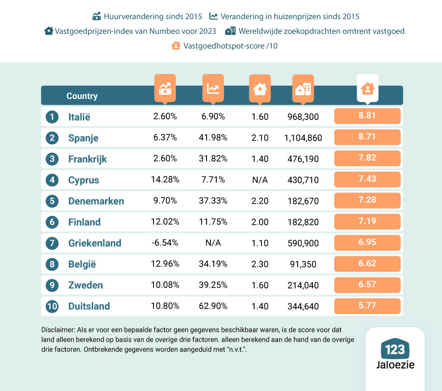 Σύμφωνα με πρόσφατη έρευνα της 123jaloezie, η οποία μελετά την πορεία των τιμών στην αγορά ακινήτων από το 2015 μέχρι σήμερα, σε διάφορες ευρωπαϊκές χώρες, διαπιστώθηκε πως η Ιταλία αποτελεί το κορυφαίο hotspot για αγοραστές.