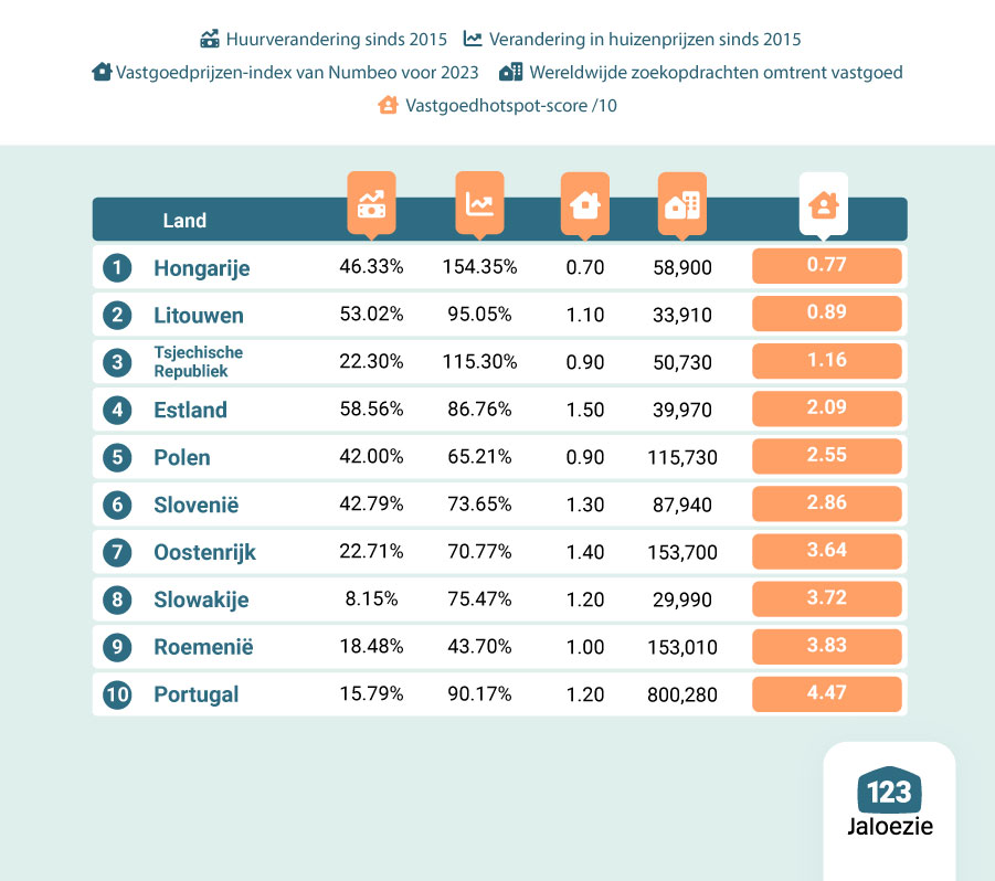 Από την άλλη πλευρά, η Ουγγαρία είναι η λιγότερο ελκυστική χώρα για πιθανούς αγοραστές με βαθμολογία μόλις 0,77 στα 10, αφού κατά μέσο όρο, οι τιμές των ακινήτων υπερδιπλασιάστηκαν, από το 2015. Υπάρχουν επίσης, σχετικά λίγες αναζητήσεις ακινήτων που επικεντρώνονται στην Ουγγαρία, με μόνο 58.900 τους τελευταίους δώδεκα μήνες.
