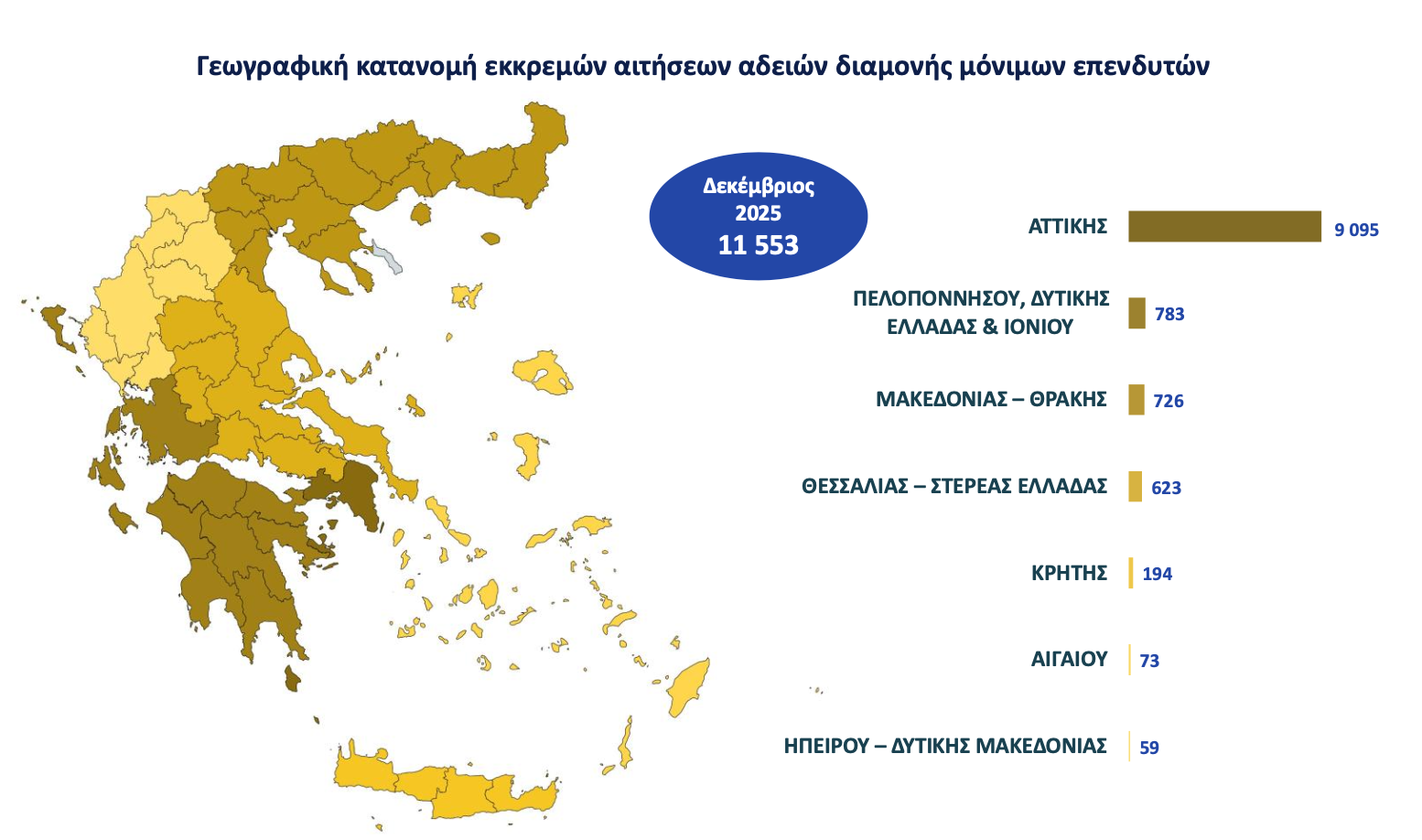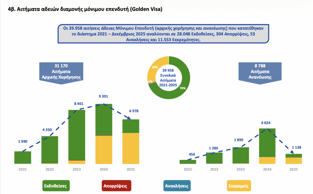 -Για την περίοδο 2021- 2025 τα συνολικά αιτήματα αδειών διαμονής μονίμου επενδυτή Golden Visa ανήλθαν σε 39.958, εκ των οποίων 31.170 είναι τα αιτήματα αρχικής χορήγησης και τα υπόλοιπα 8.788 τα αιτήματα ανανέωσης.