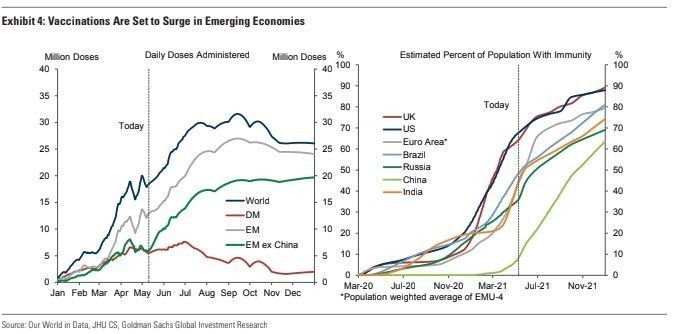 Εκτιμάται ότι χορηγούνται 20 εκατ. δόσεις ημερησίως αυτή τη στιγμή και αυτός ο αριθμός θα αυξηθεί σε τουλάχιστον 30 εκατ. δόσεις/ημέρα ως τον Ιούλιο. Παράλληλα, ένα μεγαλύτερο ποσοστό εμβολίων θα κατευθυνθεί προς τις αναδυόμενες χώρες καθώς η ζήτηση σταδιακά μειώνεται στις ΗΠΑ και τις άλλες ανεπτυγμένες οικονομίες.