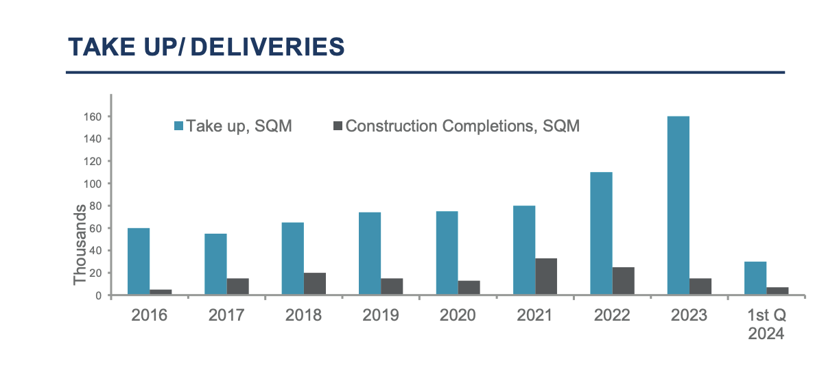 Οσον αφορά τις προοπτικές της αγοράς, η συνεχιζόμενη, ισχυρή ζήτηση για γραφεία πολύ υψηλών προδιαγραφών σε συνδυασμό με τις σχετικά πιο περιορισμένες νέες αναπτύξεις συντηρούν τελικά και τα υψηλά ενοίκια. Eνδεικτικά, κατά το δεύτερο τρίμηνο του 2024, ολοκληρώθηκαν 28.000 τ.μ. χώρων γραφείων στην Αθήνα, εκ των οποίων το 70% ήταν είτε ήδη προ-μισθωμένο είτε υπό συζήτηση/ προσφορά από κάποιον ενδιαφερόμενο μισθωτή. Ο Πύργος Πειραιά ήταν το μεγαλύτερο νέο κτίριο που παραδόθηκε στην περίοδο του β’ τριμήνου του έτους, το δεύτερο ψηλότερο κτίριο 22 επιπέδων στην Αθήνα και το πρώτο «πράσινο» πολυώροφο κτίριο στην Ελλάδα. Στο τέλος του 2ου τριμήνου ήταν υπό κατασκευή 197.400 τ.μ. με προοπτική παράδοσης έως το 2027, με το 45% να έχει ήδη προ-μισθωθεί. Τα θεμελιώδη μεγέθη της αγοράς μίσθωσης γραφειακών χώρων αναμένεται να παραμείνουν σε θετικό πρόσημο, όπως και η ζήτηση, η οποία εκτιμάται ότι θα παραμείνει σε υψηλά επίπεδα ειδικά για τους «πράσινους» γραφειακούς χώρους υψηλών ποιοτικών προδιαγραφών.
