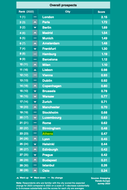 Στην 23η θέση στην Ευρώπη σε ένα σύνολο 30 ευρωπαϊκών μεγαλουπόλεων συγκαταλέγεται η Αθήνα όσον αφορά τις προοπτικές στην αγορά ακινήτων για το 2023, ενώ το τοπ 3 των ευρωπαϊκών μεγαλουπόλεων απαρτίζουν το Λονδίνο, το Παρίσι και το Βερολίνο. Η θέση της ελληνικής πρωτεύουσας παραμένει σταθερή σε σχέση με πέρυσι, όπως σταθερή παραμένει και η τριάδα των πιο ισχυρών αγορών έστω κι αν γενικότερα ο πήχης των προσδοκιών του κλάδου είναι σαφώς χαμηλότερος φέτος όπως τουλάχιστον προκύπτει από τις απόψεις που εκφράζουν οι εκπρόσωποι της αγοράς.