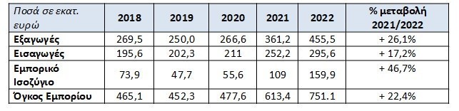Κατά το Α΄ εννεάμηνο του 2023, πάντως, καταγράφεται ελαφρά κάμψη της αξίας του διμερούς εμπορίου, ιδίως ως προς τις ελληνικές εξαγωγές. Συγκεκριμένα απ’ τον Ιανουάριο ως και το Σεπτέμβριο του 2023 ο όγκος του εμπορίου ήταν 540 εκατ. ευρώ (-5,3% σε σχέση με ένα χρόνο πριν), οι εξαγωγές 310,7 εκατ. ευρώ (-10 εκατ. ευρώ) ενώ οι εισαγωγές αυξήθηκαν 2%, φθάνοντας τα 229,3 εκατ. ευρώ. Ως εκ τούτου το εμπορικό πλεόνασμα περιορίστηκε στα 81,4 εκατ. ευρώ έναντι 120,6 εκατ. ευρώ που ήταν στο εννεάμηνο Ιανουαρίου – Σεπτεμβρίου 2022.