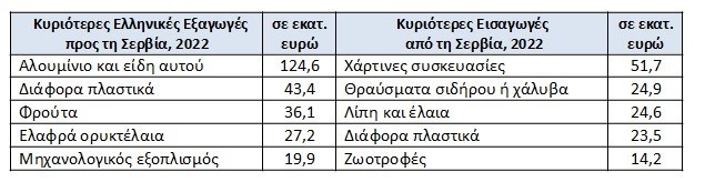 Διαχρονικά, το μερίδιο των γεωργικών προϊόντων & τροφίμων αντιστοιχεί στο 50% περίπου του συνολικού διμερούς εμπορίου Ελλάδας-Σερβίας. Εξάγουμε κυρίως είδη αλουμινίου, πλαστικά είδη, γεωργικά προϊόντα & τρόφιμα, ελαφρά ορυκτέλαια και μηχανολογικό εξοπλισμό. Αντίστοιχα εισάγουμε χάρτινες συσκευασίες, θραύσματα σιδήρου ή χάλυβα, διάφορα πλαστικά, ζωοτροφές κοκ