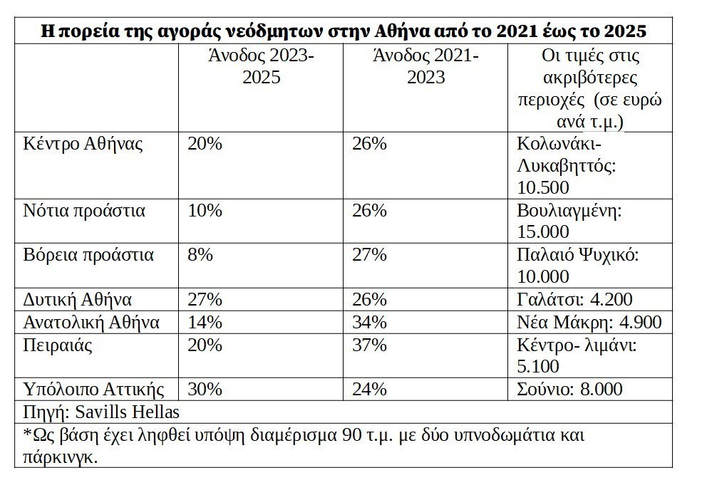 Ενδεικτικά ως προς τις τιμές, στο Κολωνάκι τα premium νεόδμητα ακίνητα πωλούνται με μία μέση τιμή στα 10.500 ευρώ ανά τ.μ., στη Βουλιαγμένη στα 15.000 ευρώ ανά τ.μ., στο Παλαιό Ψυχικό στα 10.000 ευρώ ανά τ.μ.. Προς τα δυτικά, το Γαλάτσι είναι η πιο ακριβή περιοχή με 4.200 ευρώ ανά τ.μ. και στα ανατολικά η Νέα Μάκρη με 4.900 ευρώ ανά τ.μ., ενώ στον Πειραιά το αντίστοιχο νούμερο ανεβαίνει στις 5.100 ευρώ ανά τ.μ.. Αντίστοιχα για το υπόλοιπο Αττικής, στο Σούνιο το αντίστοιχο νούμερο ανεβαίνει στις 8.000 ευρώ ανά τ.μ..