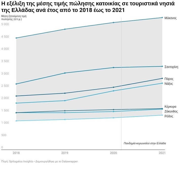 Κέρκυρα & Ζάκυνθος: Όσον αφορά το Ιόνιο Πέλαγος, η Κέρκυρα και η Ζάκυνθος κινούνται περίπου στα ίδια επίπεδα ως προς τη μέση ζητούμενη τιμή πώλησης κατοικιών, συγκριτικά με τις υπόλοιπες περιπτώσεις που εξετάσθηκαν. Αξίζει να σημειωθεί η ανοδική πορεία της μέσης τιμής πώλησης κατοικίας στην Ζάκυνθο, με μεταβολή +6,3% το 2021 σε σχέση με το 2020, εν καιρώ πανδημίας.