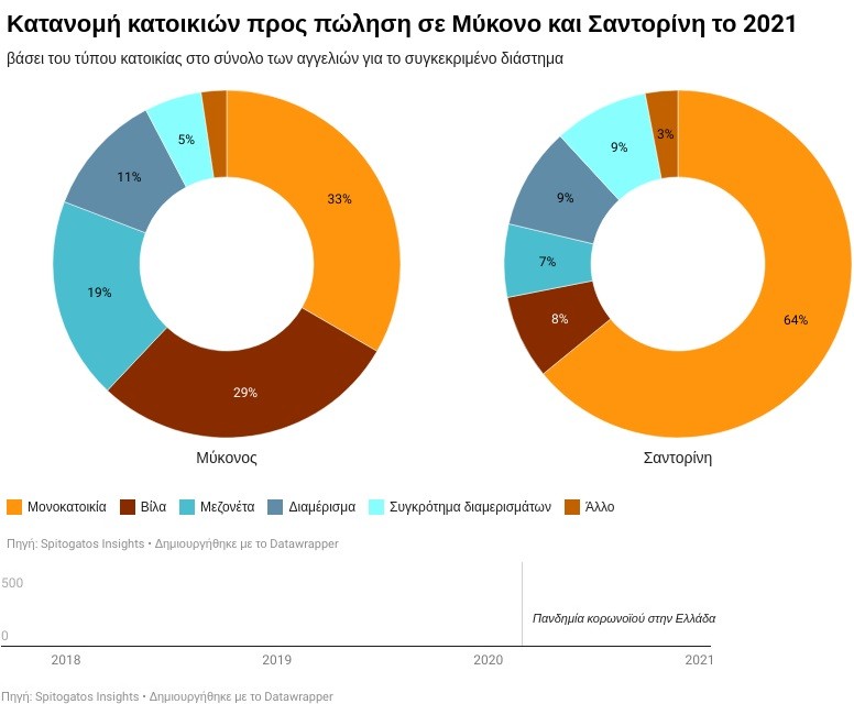 Εστιάζοντας στην τυπολογία των ακινήτων, παρατηρείται πως στη Μύκονο αρκετές αγγελίες ανά έτος, από το 2018 έως και το 2021, αφορούσαν πώληση βιλών, με το αντίστοιχο ποσοστό στη Σαντορίνη να παρουσιάζεται χαμηλότερο.